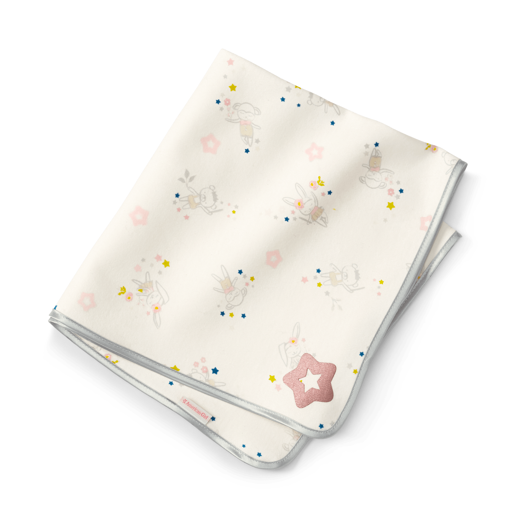 Your little one can bundle up Baby in this soft-as-can-be blanket that has an allover print of Bitty Baby’s favorite animals, a satin binding, and a printed metallic star in the corner.