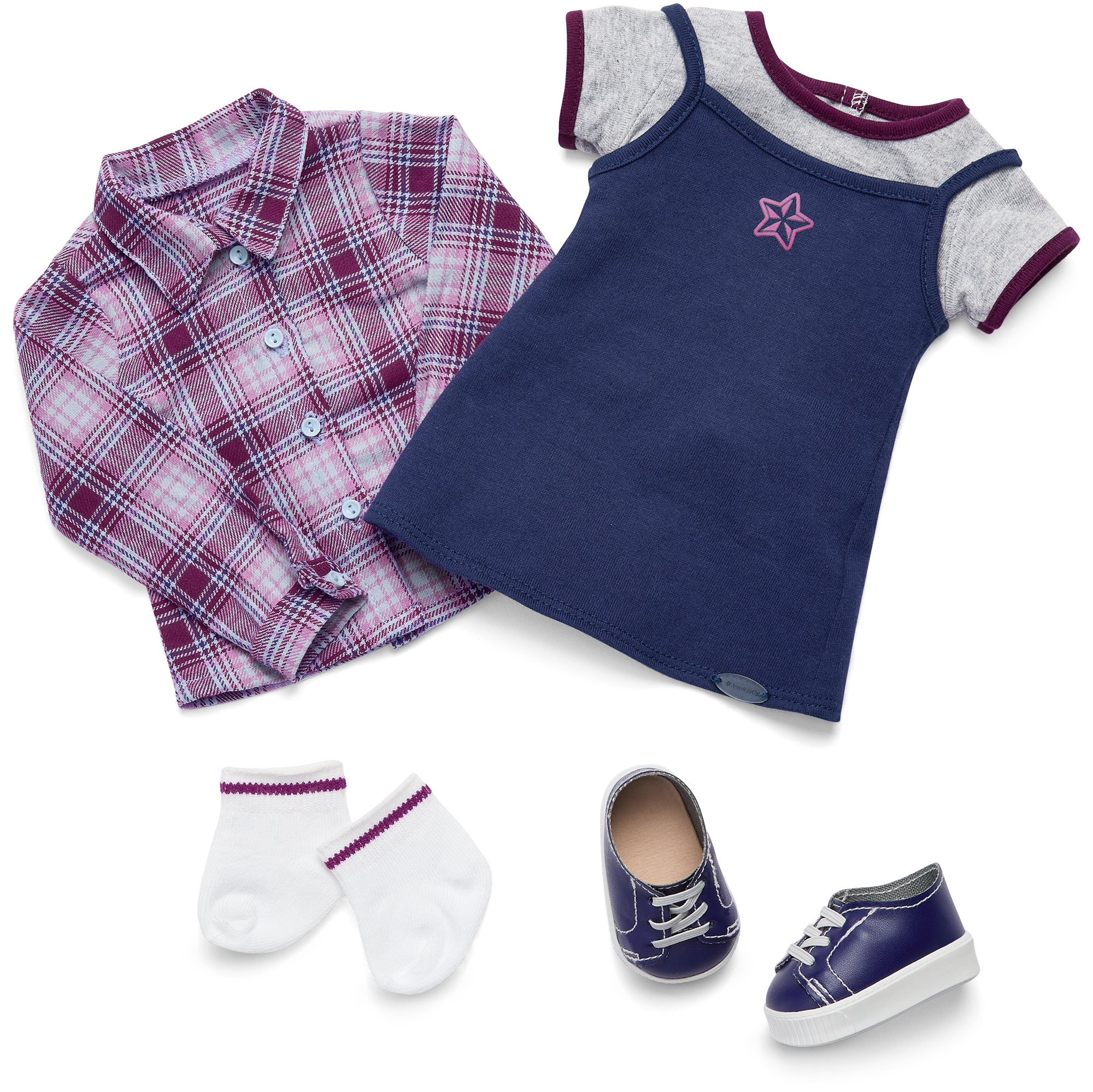 A gray heather-knit T-shirt with purple binding at the sleeves and neckline, a navy knit T-shirt dress with a star graphic on the front, a purple plaid flannel shirt, white ankle socks, platform sneakers with white soles, and cotton underwear