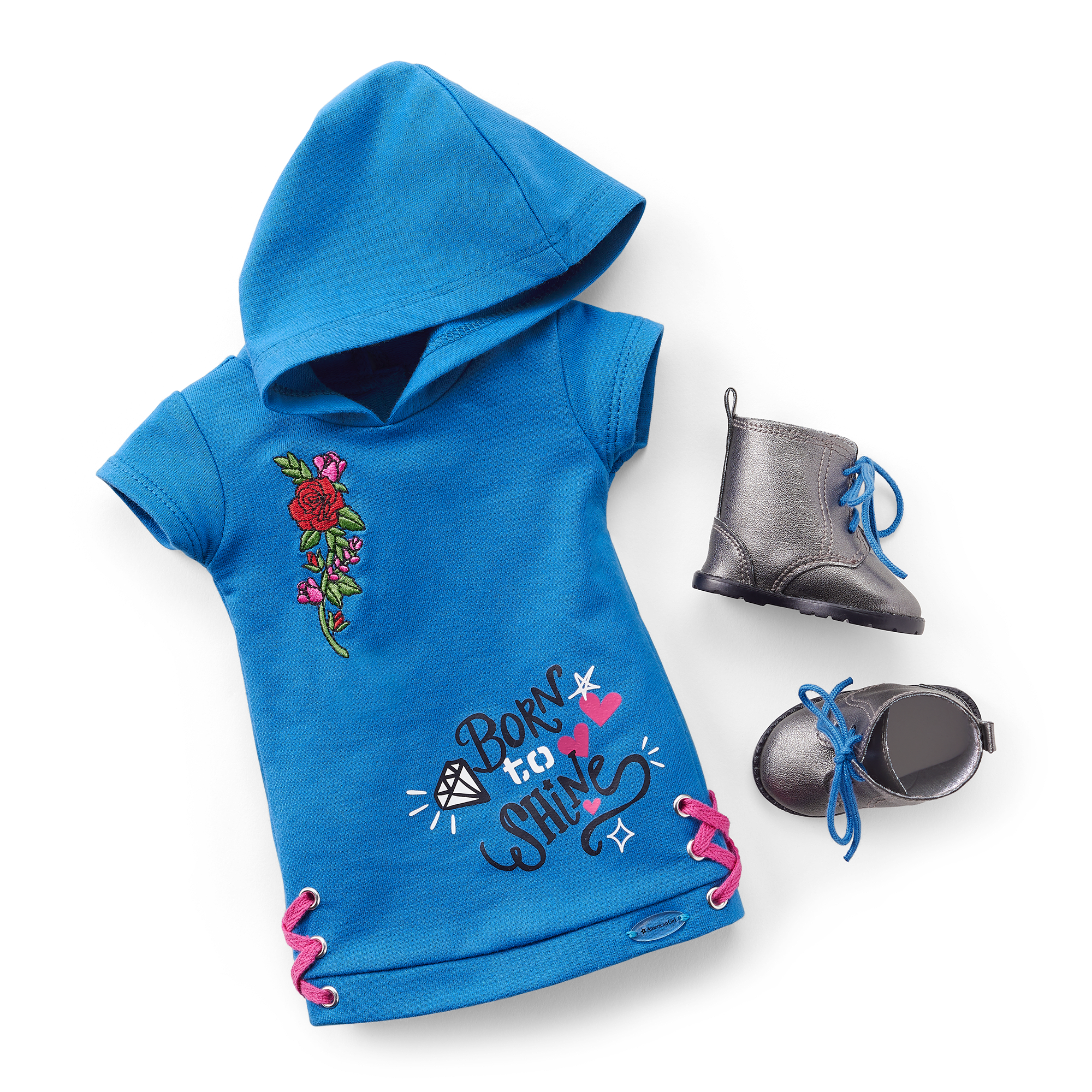 A blue hooded dress with hot pink lace-up details at the hem, a “Born to Shine” screen-print graphic and embroidered flowers on the chest